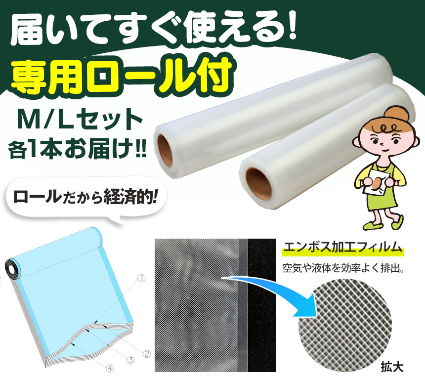 | セット内容 | 本体、専用ロールフレッシュパックんL(28cm×3m)×1本、専用ロールフレッシュパックんM(20cm×3m)×1本、 ボトルストッパー×1、キャニスターホース1本 |