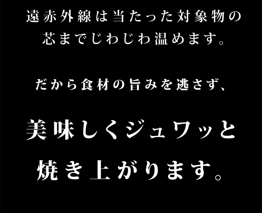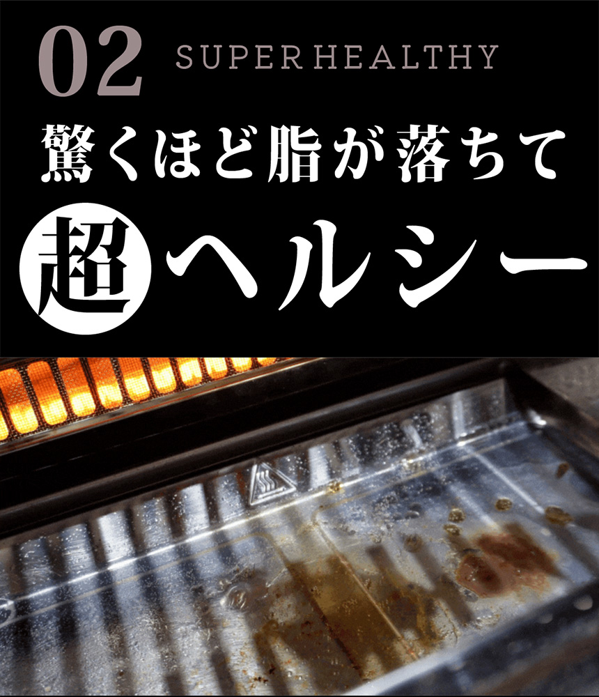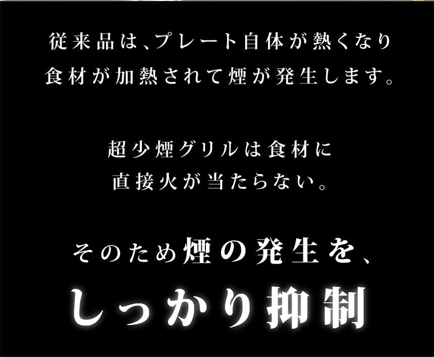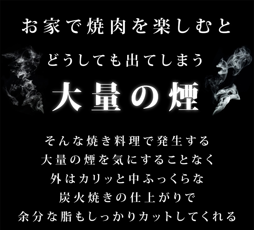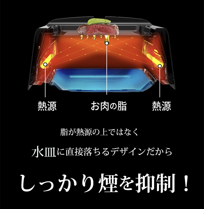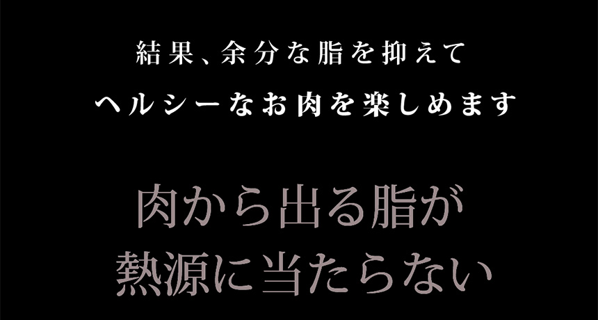 | 驚くほど煙が出ない異次元の超少煙グリル! 熱源をグリルのサイドに配置し、油を下に落とすので、油と熱源が触れないことで煙が出ない構造。 熱源回りもミラーフィニッシュのステンレスを使用しているのでサイドからの熱を食材に反射させ、ムラなくしっかりと焼けます。 遠赤外線効果により、食材の芯までじんわりと焼けるので、まるで炭火焼きのように柔らく旨みを閉じ込めた美味しい焼き上がりになります。 |