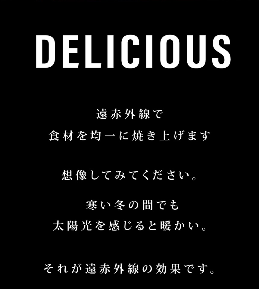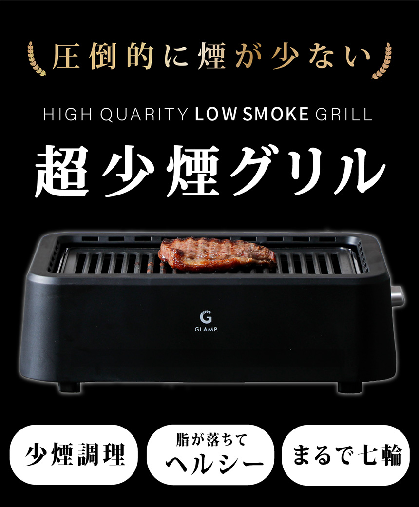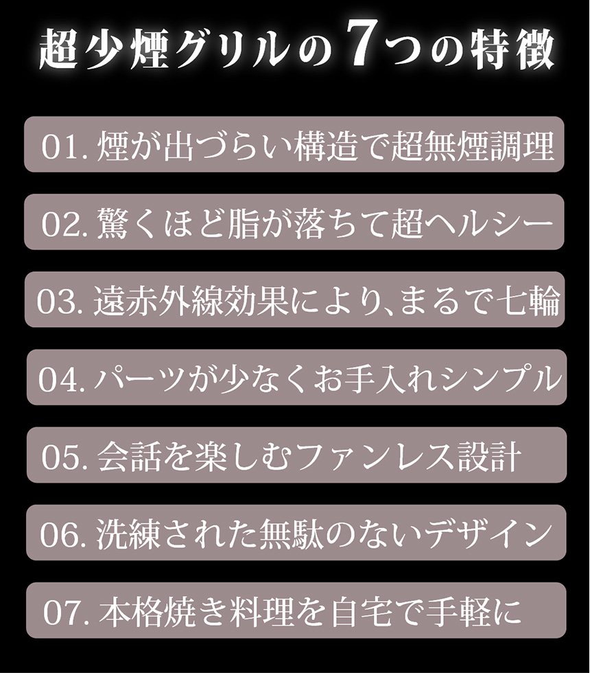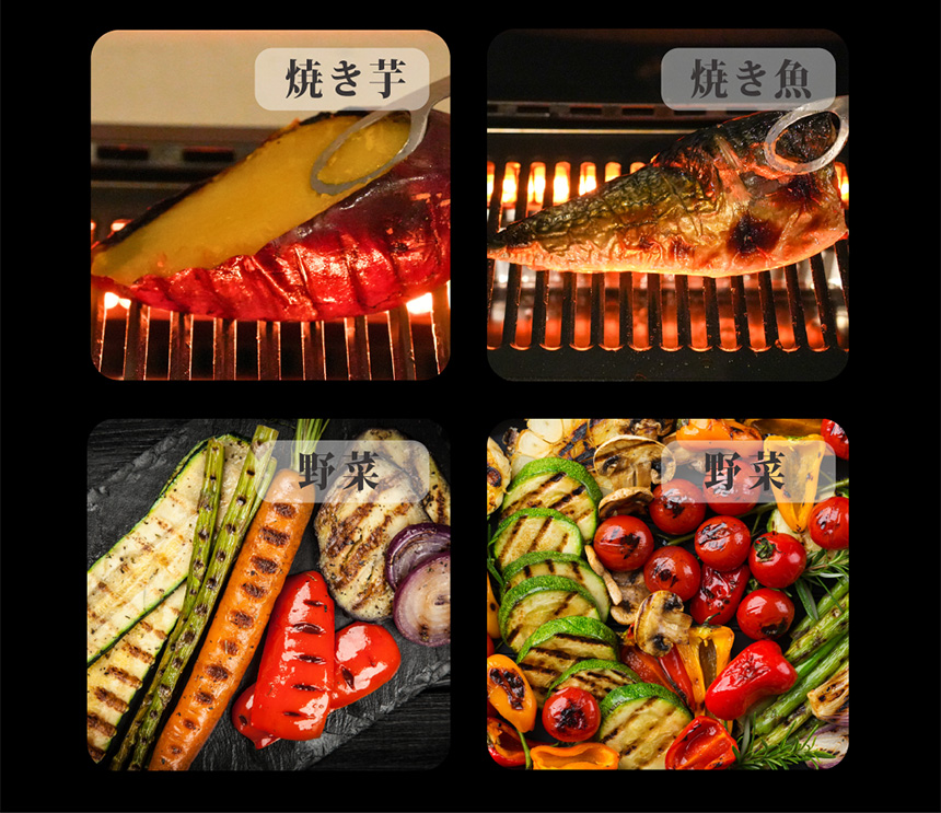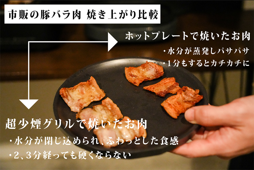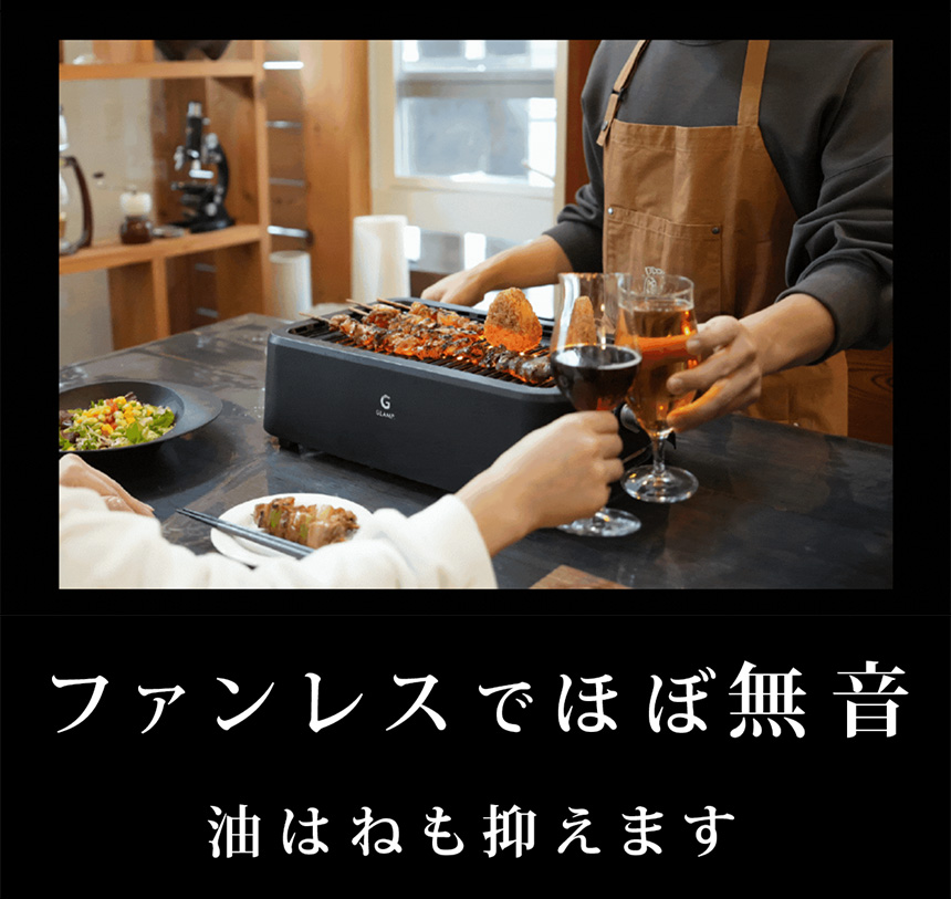 | 驚くほど煙が出ない異次元の超少煙グリル! 熱源をグリルのサイドに配置し、油を下に落とすので、油と熱源が触れないことで煙が出ない構造。 熱源回りもミラーフィニッシュのステンレスを使用しているのでサイドからの熱を食材に反射させ、ムラなくしっかりと焼けます。 遠赤外線効果により、食材の芯までじんわりと焼けるので、まるで炭火焼きのように柔らく旨みを閉じ込めた美味しい焼き上がりになります。 |