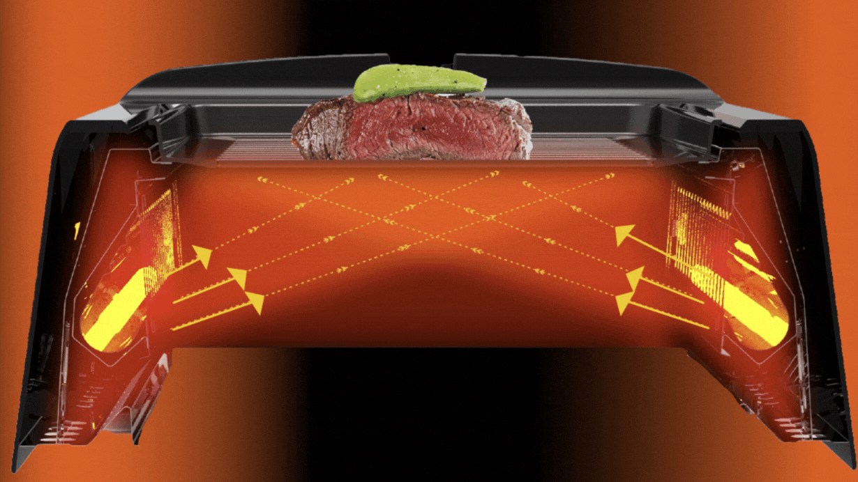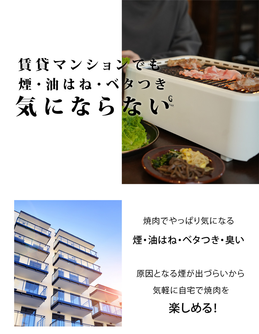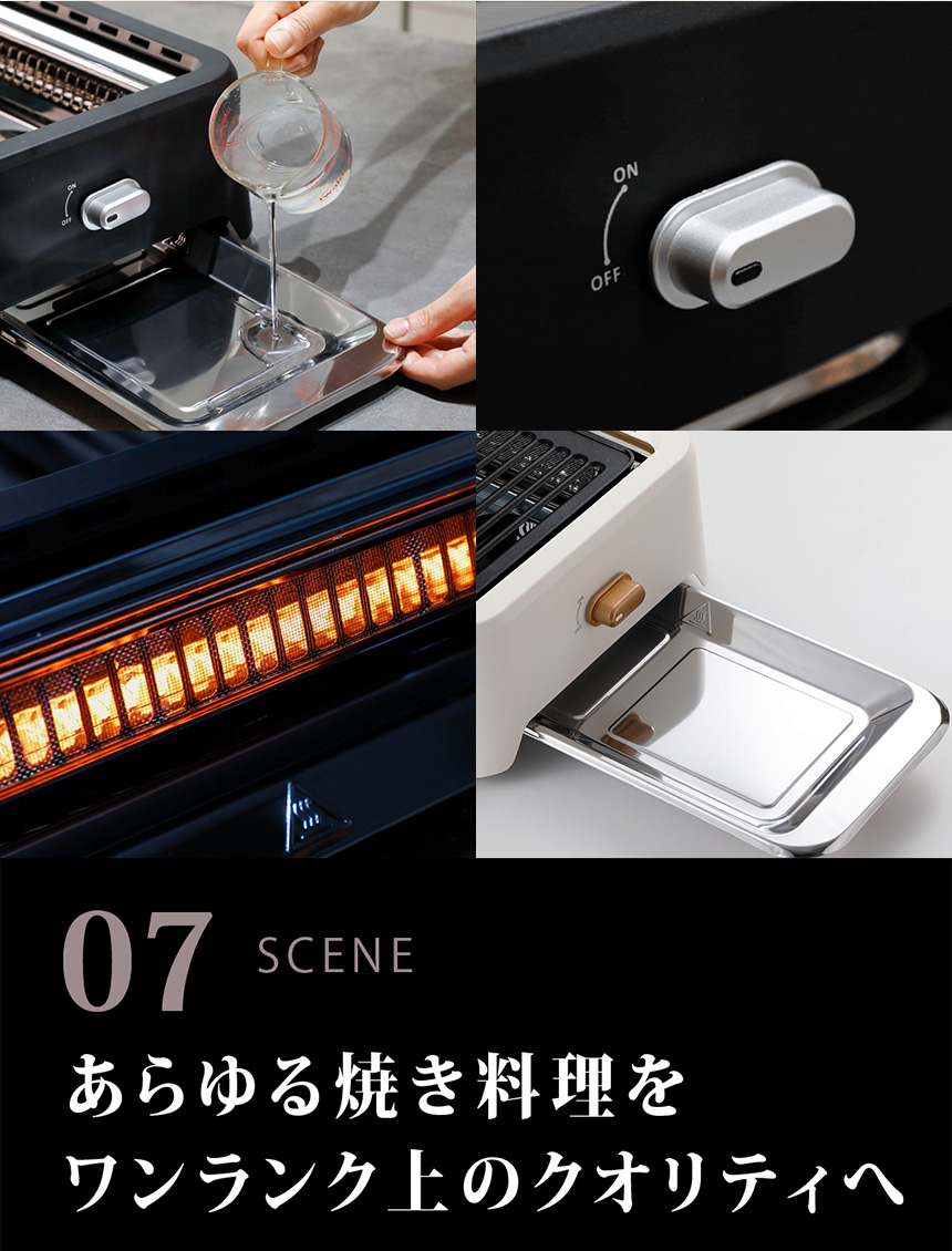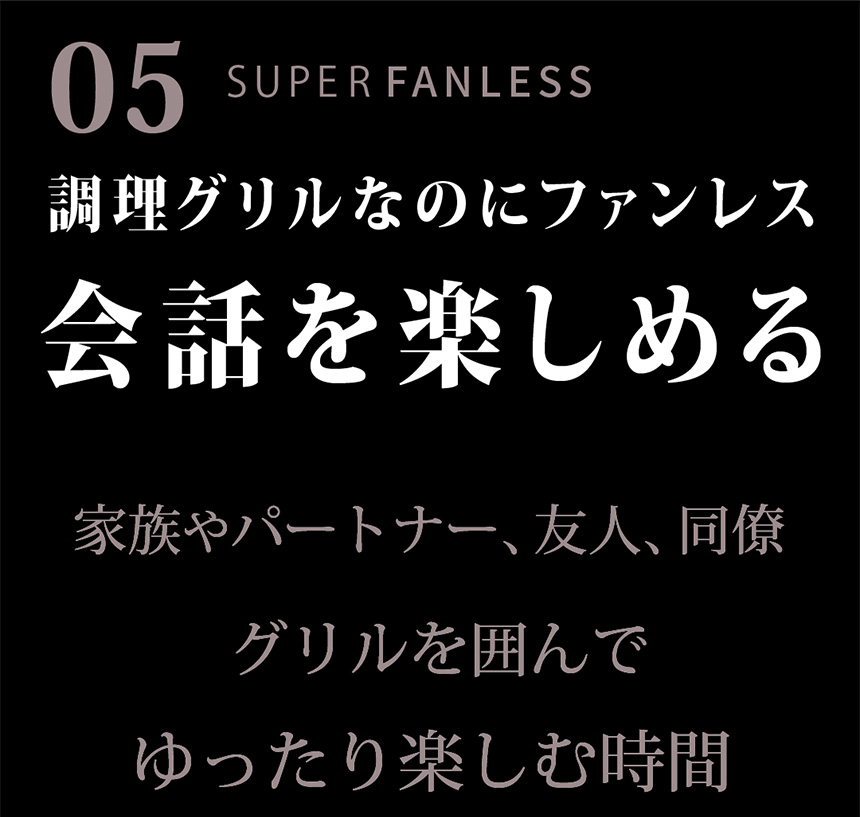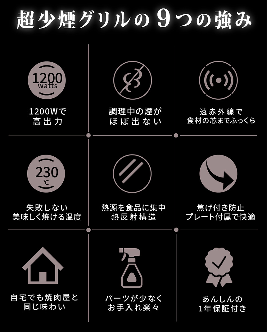 | 驚くほど煙が出ない異次元の超少煙グリル! 熱源をグリルのサイドに配置し、油を下に落とすので、油と熱源が触れないことで煙が出ない構造。 熱源回りもミラーフィニッシュのステンレスを使用しているのでサイドからの熱を食材に反射させ、ムラなくしっかりと焼けます。 遠赤外線効果により、食材の芯までじんわりと焼けるので、まるで炭火焼きのように柔らく旨みを閉じ込めた美味しい焼き上がりになります。 |