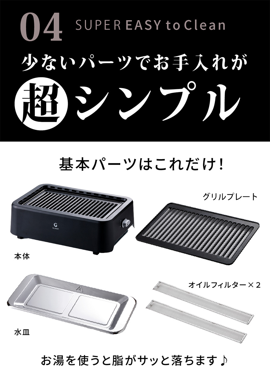 | 材質 | 本体/PBT樹脂 フィルター・オイルドリップトレー/ステンレススチール グリルプレート/アルミニウム(テフロン加工) |