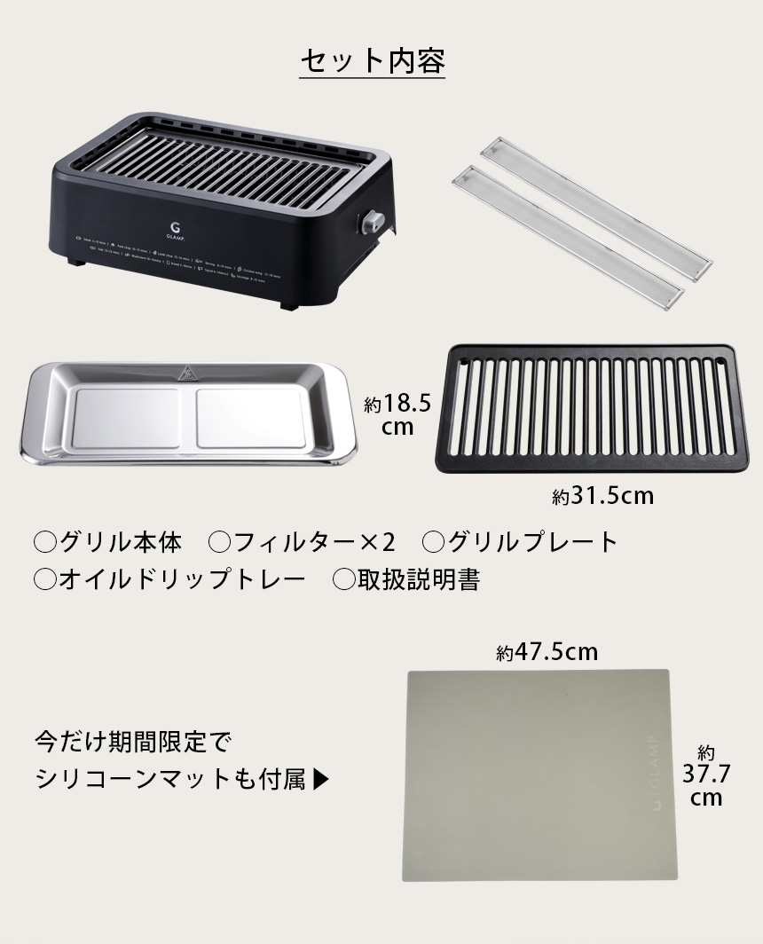 | セット内容 | グリル本体、フィルター×2、グリルプレート、オイルドリップトレー、取扱説明書 ※今だけ期間限定でシリコーンマットも付属。 |