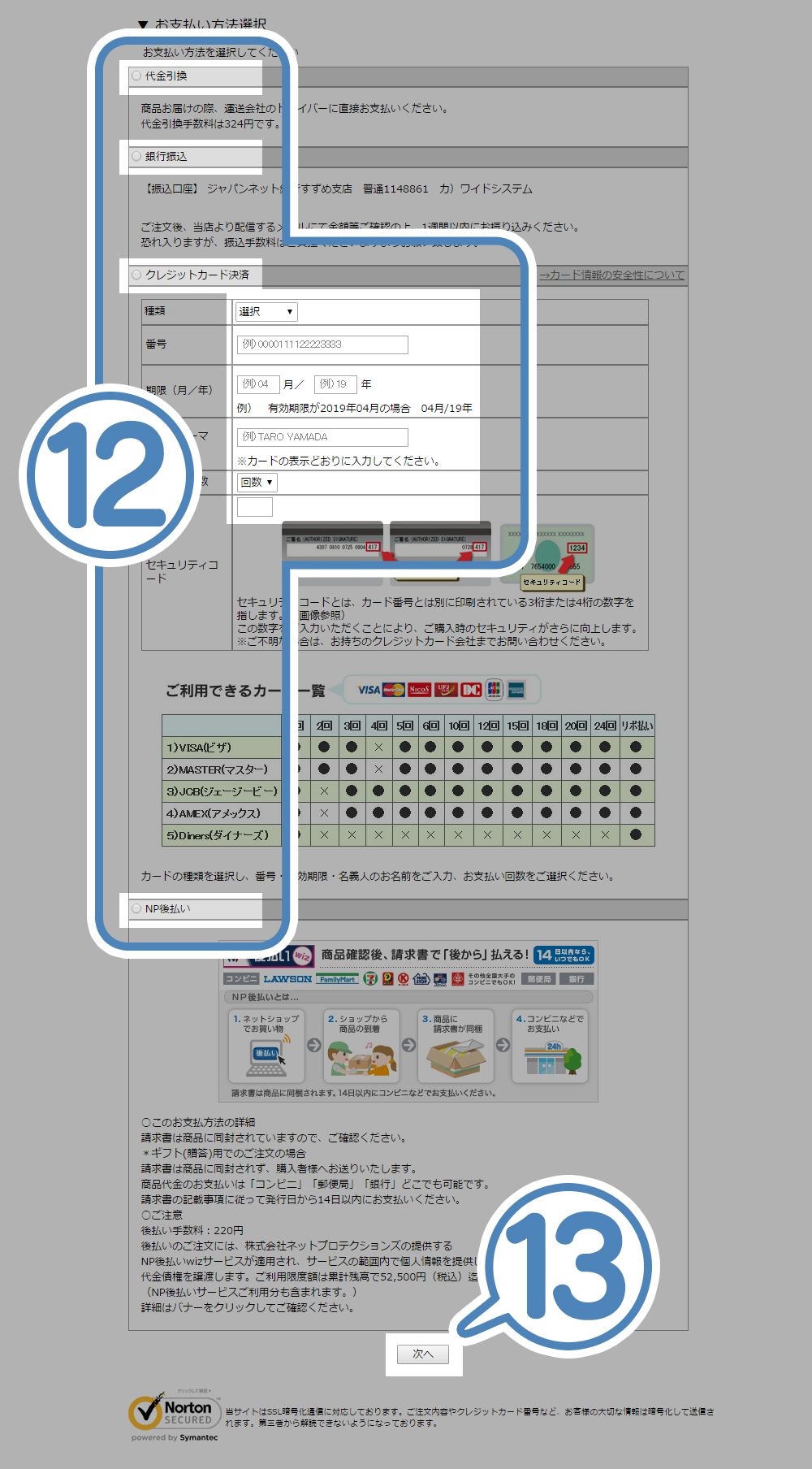 ⑫代金引換・銀行振込・クレジットカート・クロネコ代金後払い(コンビニ・郵便局)の、4種類のうち、1種類を選びます。