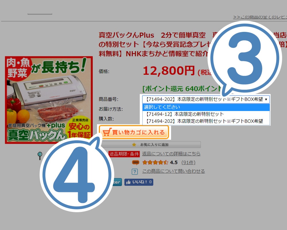 ご注文する商品が決まりましたら、④の「買い物カゴに入れる」ボタンを押しましょう。