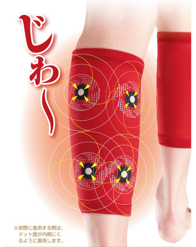 冷えたふくらはぎを温かく包み込みます。伸縮性、弾力性、保湿性に優れた材質を採用しているため、若い方からシニアまで安心してお使いいただけます。4個の医療機器用の永久磁石の効果で、ふくらはぎを挟み込むように磁気が働いて、血行を促進、つらい筋肉のハリ・コリを治療します。