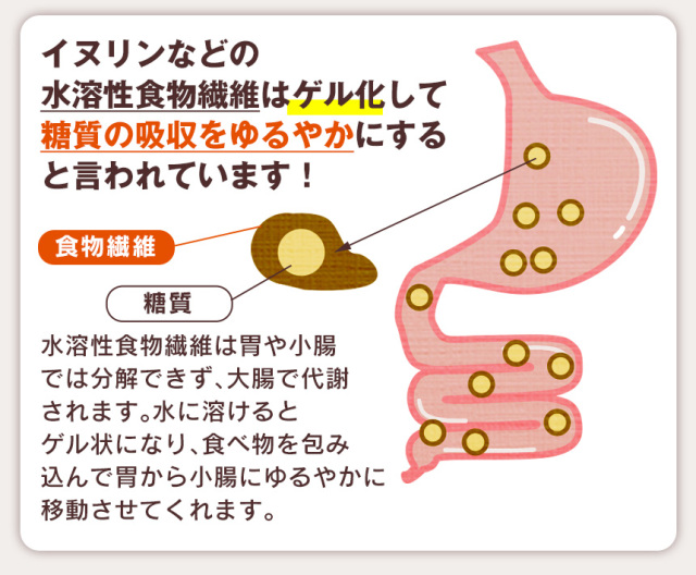 ・イヌリンなどの水溶性食物繊維は、ゲル化して糖質の吸収をゆるやかにすると言われています。