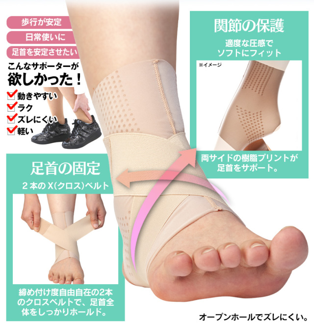 締め付け度自由自在の2本のクロスベルトで、足首全体をしっかりホールド。