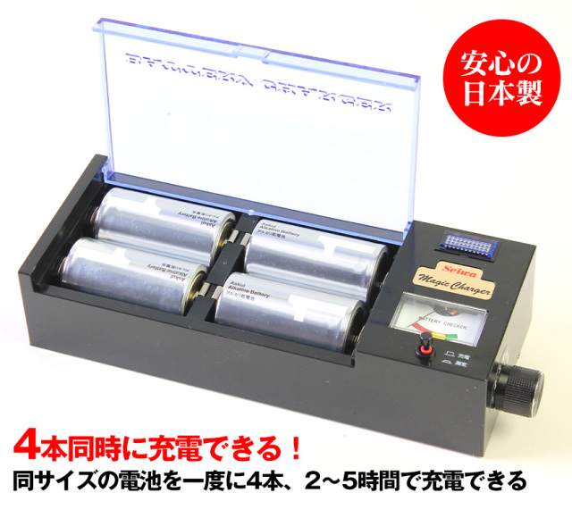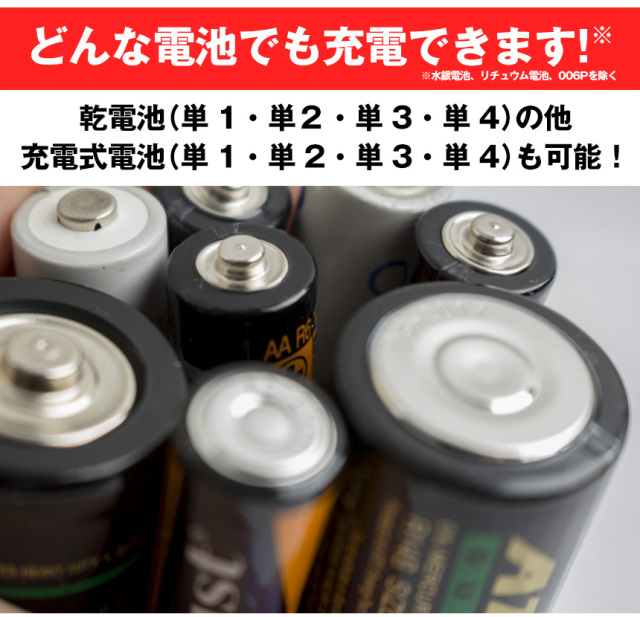 ・単1-単4までの乾電池及びニッカド電池・ニッケル水素電池の充電が可能。
