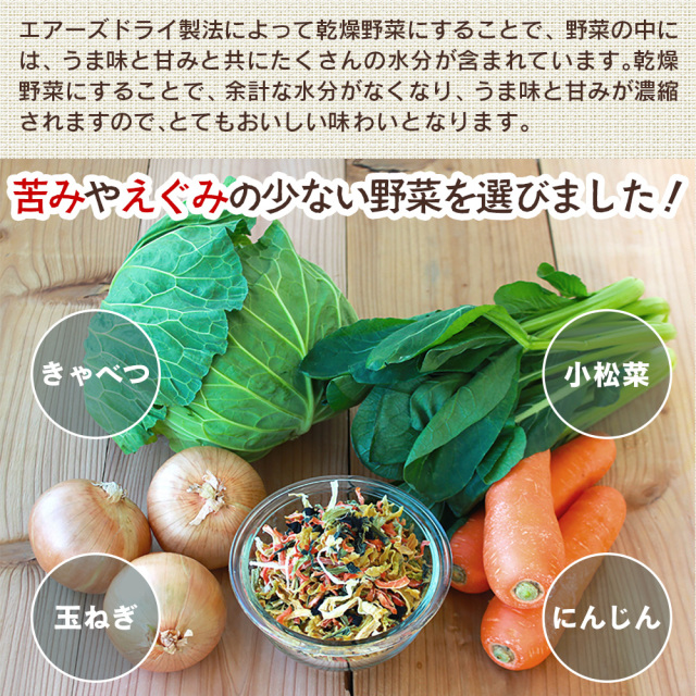 野菜【キャベツ(国産)、人参(国産)、小松菜(国産)、玉ねぎ(国産)】、ブドウ糖