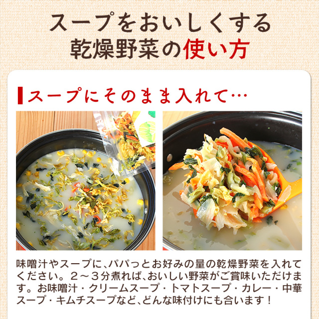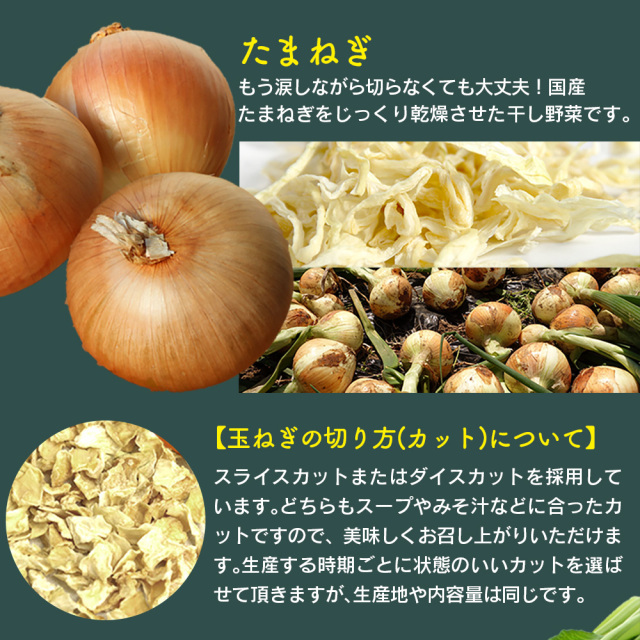 ※【ブドウ糖について】戻す時間を早める(吸湿性がよくなる)ためと、乾燥の状態で折れたり、砕けたりするのを防ぐために乾燥野菜の製造中に使用しています。 ※開封後はチャック袋をしっかり締め、高温多湿・直射日光を避け、常温で保存してください。 ※時期や状態によって玉ねぎのカットが「スライスカット」もしくは「ダイスカット」に変わります。生産地や内容量に違いはございません。なお、ご注文の際にカットをご選択いただくことや、到着後にご返品をお受けすることはできませんのであらかじめご了承ください。 |