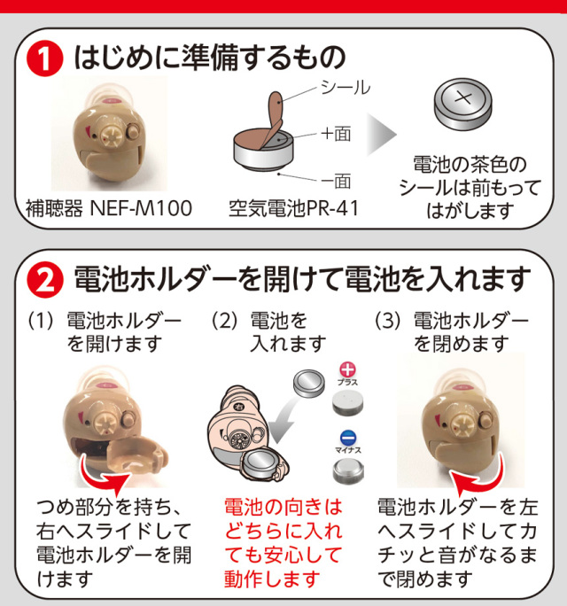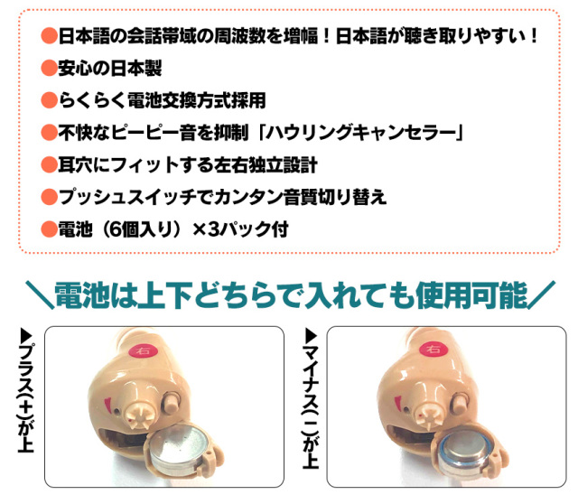 本体(右耳用)、耳栓(S・M・L各1個)、掃除用マグネット付ブラシ、空気電池1個、携帯用ハードケース、取扱説明書、保証書 |