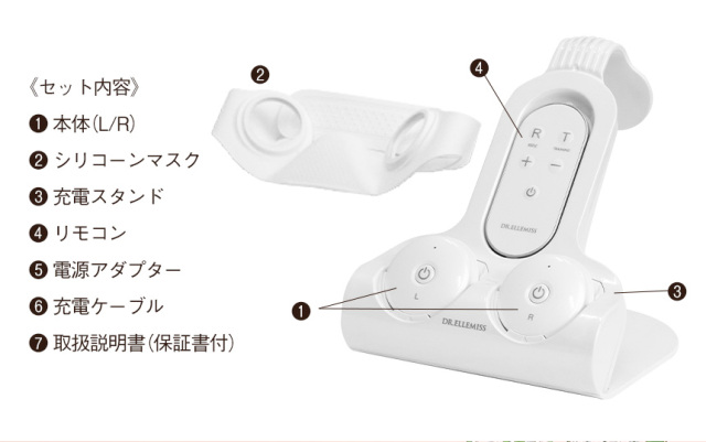 本体(L/R)、シリコーンマスク、充電スタンド、リモコン、電源アダプター、充電ケーブル、取扱説明書(保証書付) |