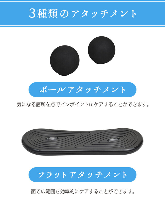 本体、アタッチメント(ボール、フラット、ウェーブ)、クッション、ACアダプター、取扱説明書 |