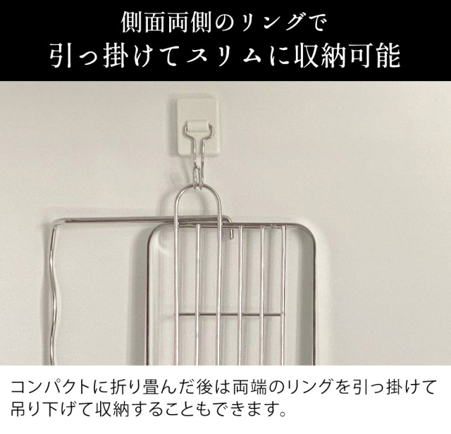 折り畳むと高さ約2.3cmと薄型。収納スペースも困りません。また、引っ掛け収納も可能です。