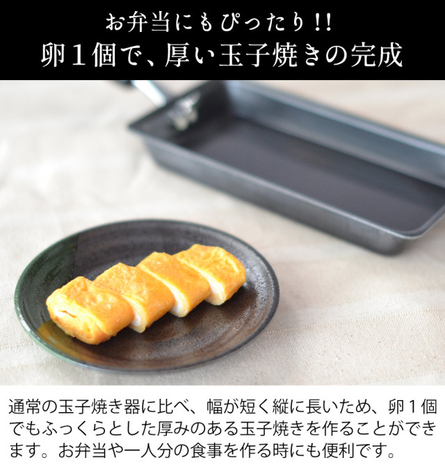 通常の玉子焼き器に比べ、幅が短く縦に長いため、卵1個でも厚みのある玉子焼きを作ることができます。鉄のフライパンは育てながら使う一生もの。