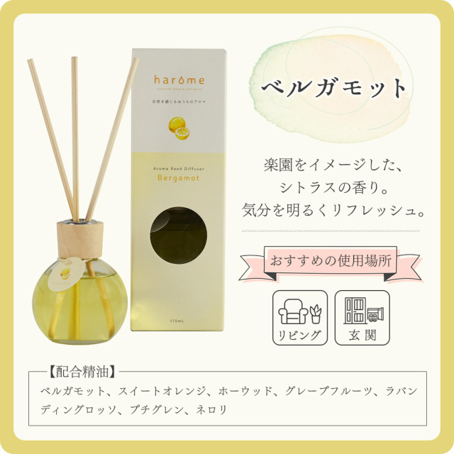 ベルガモット、スイートオレンジ、ホーウッド、グレープフルーツ、ラバンディングロッソ、プチグレン、ネロリ