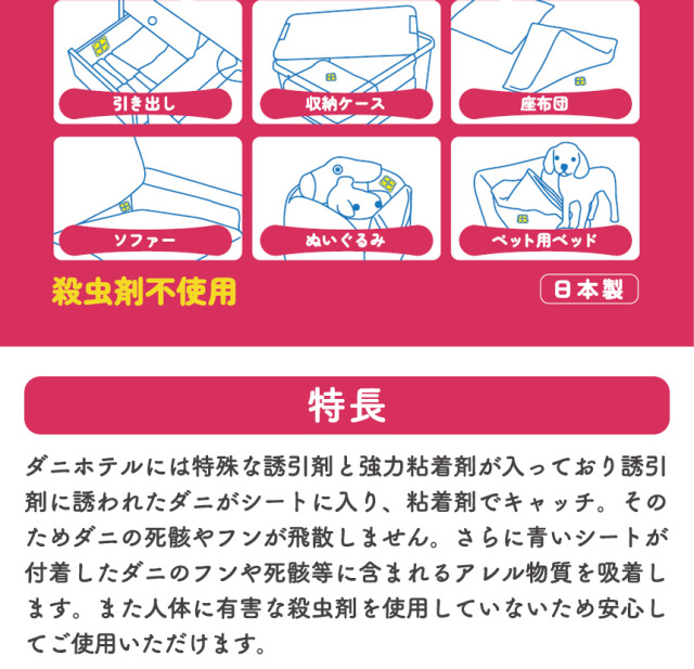 ・ダニホテルには特殊な誘引剤と強力粘着剤が入っており、誘引剤に誘われたダニがシートに入り、粘着剤でキャッチ。