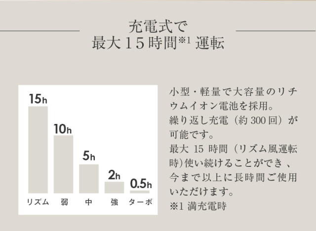 リズム風/約15h、弱/約10h、中/約5h、強/約2h、ターボ/約0.5h