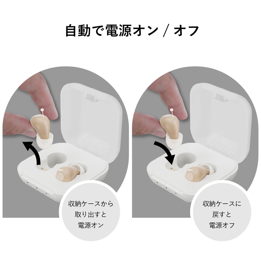 補聴器本体(2個)、収納充電ケース、USBケーブル、お掃除ブラシ ACアダプター、イヤーピース3種類×2個ずつ、取扱説明書 |
