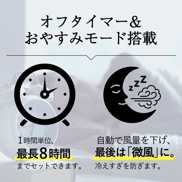 ・おやすみモードでは自動で就寝時に最適な風量に設定されるので、快適な睡眠をサポート。